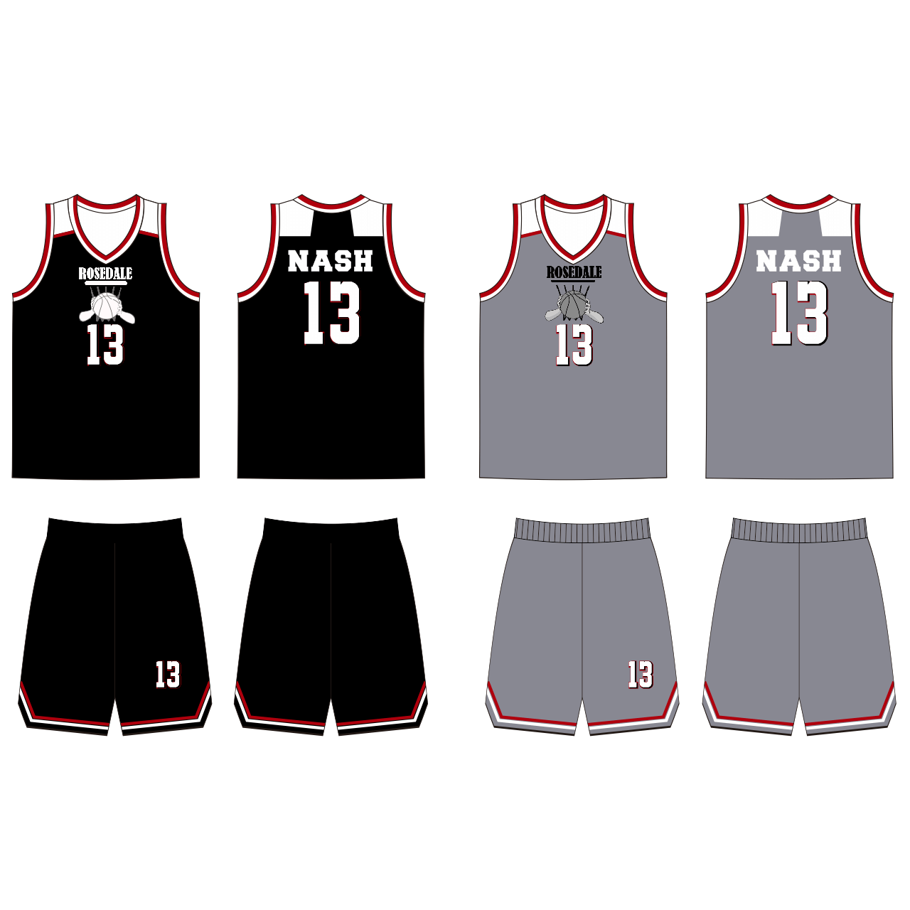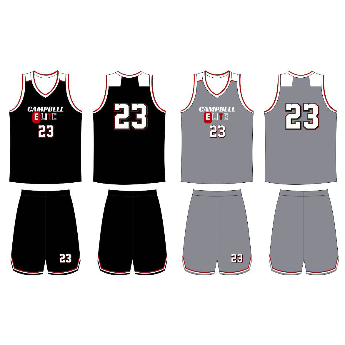 Look professional on the court with these custom design black and grey reversible basketball uniforms. No minimum order required and you can create the perfect design for your team. Durable and lightweight these uniforms allow for a full range of motion and maximum comfort.